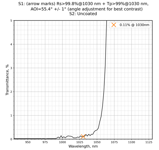 | 镀膜类型 | IBS偏振镀膜 | 镀膜参数S1 | Rs>99.8%@1030nm+Tp>99%@1030nm | |