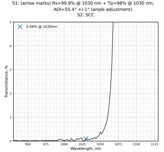 | 镀膜类型 | IBS偏振镀膜 | 镀膜参数S1 | Rs>99.9%&Tp>98%@1030nm | |