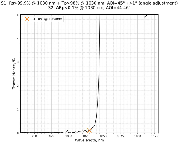 | 镀膜类型 | IBS偏振/增透镀膜 | 镀膜参数S1 | Rs>99.9%&Tp>98%@1030nm | |