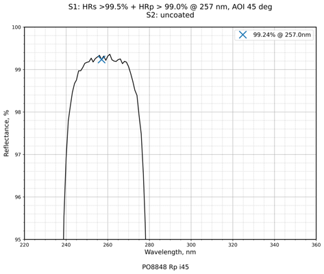| 镀膜类型 | IBS镀膜 | 镀膜参数 | S1:HRs>99.5%+HRp>99.0%@257nm / S2:Uncoated |