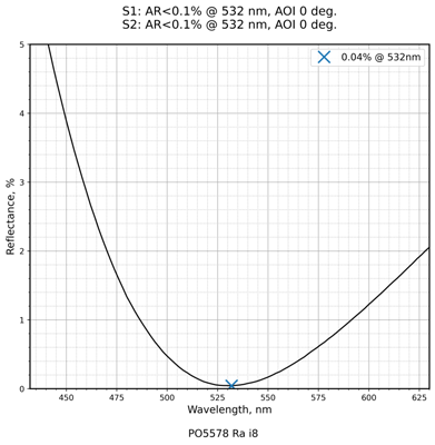 | 镀膜参数 | S1: AR<0.1%@532nm / S2: AR<0.1%@532nm | |||