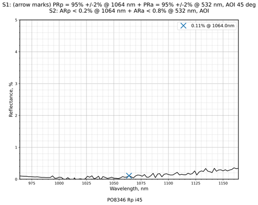 | 镀膜类型 | IBS镀膜 | 镀膜参数 | S1:PRp=95%+ / -2%@1064nm+PRa=95%+ / -2%@532nm / S2:ARp<0.2%@1064nm+ARa<0.8%@532nm |