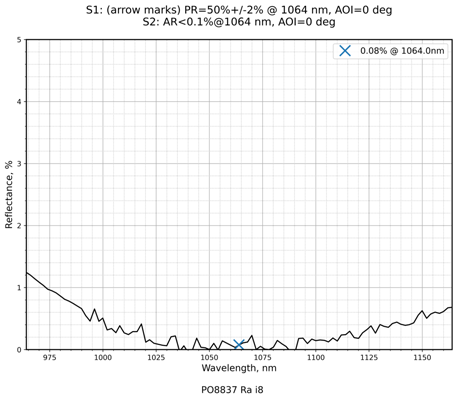 | 镀膜类型 | IBS镀膜 | 镀膜参数 | S1:PR=50%+ / -2%@1064nm / S2:AR<0.1%@1064nm |